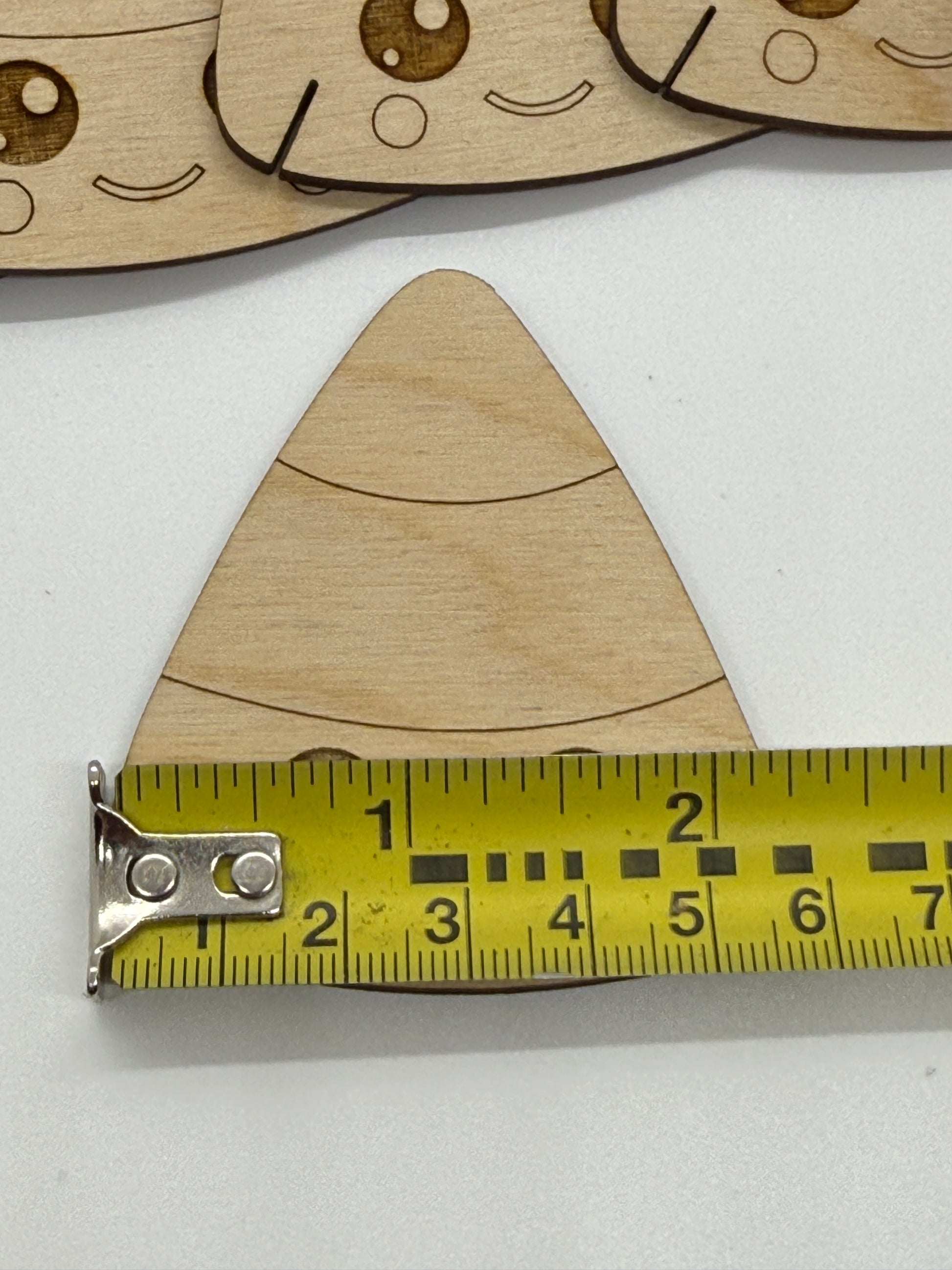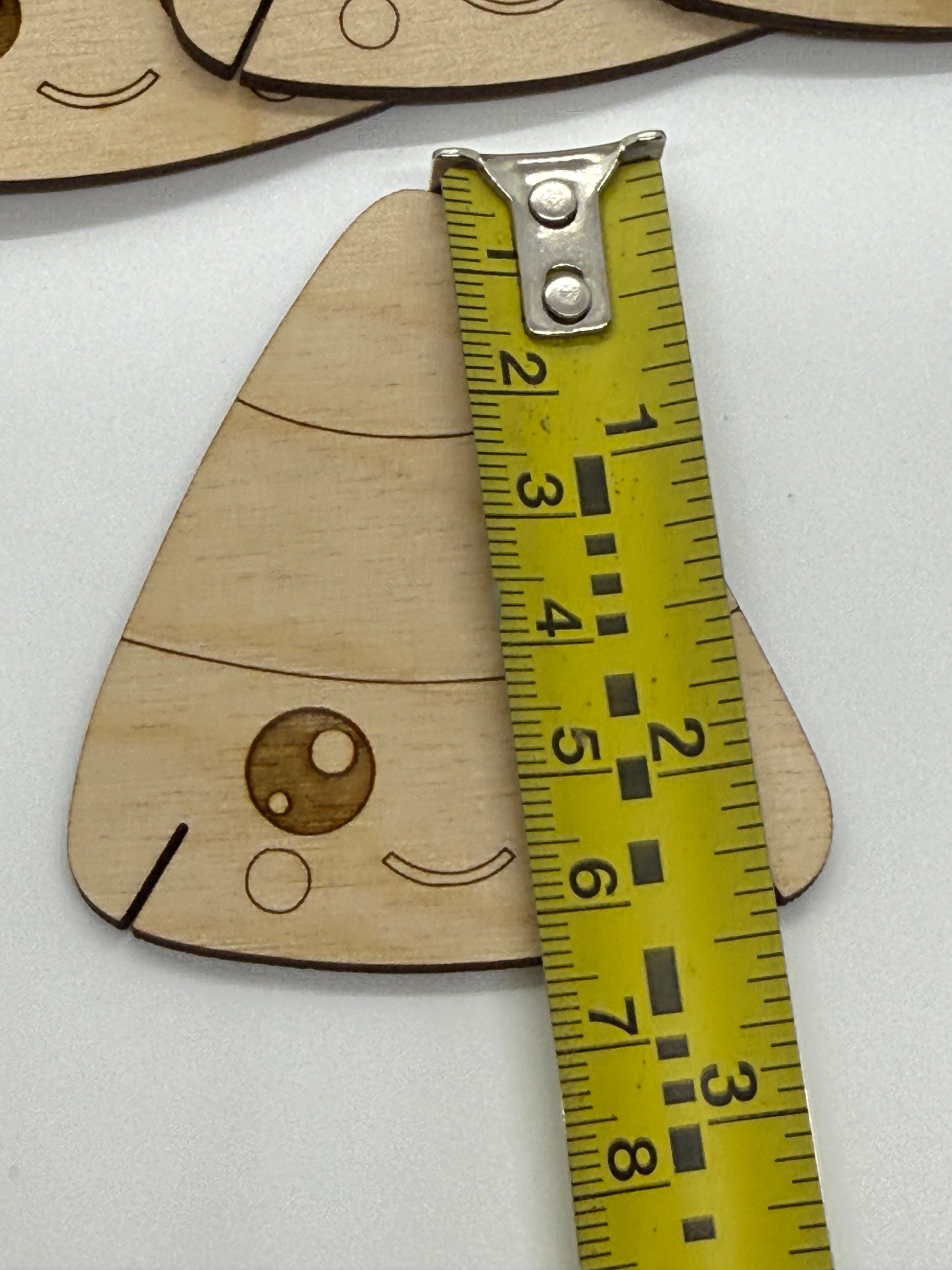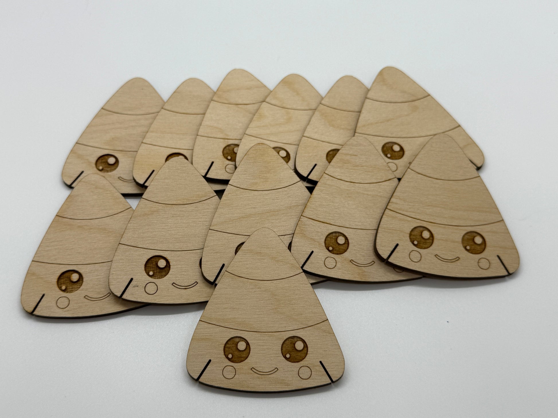 Set of 12 wooden bobbins with 12 happy candy corn shapes.